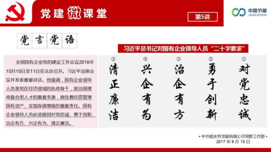 “党建微课堂”自开设以来共推出“四个意识”、“三会一课”、“习近平总书记对国有企业领导人员‘二十字要求’”等6期内容,主题鲜明、重点突出、内容简洁、方便记忆,赢得了广大党员群众的普遍认可。“党建微课堂”由党群工作部专人维护,每周推出1至2期,内容以图片形式呈现,包括党言党语、纪言纪语、节日纪律提醒、警钟长鸣、廉政风范等板块。内容编排上,主要结合中央最新精神及社会时政热点,及时向党员推送党建知识、党章党规、系列讲话等内容,将系统的知识化整为零。同时,也会结合对近年来国有企业相关案例,积极探索正反对比教育,用正面典型激励人,用反面典型警示人,教育广大党员干部既要坚守信仰又要守住底线。