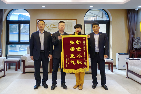 3月23日上午,中国节能收获一面写有“弘扬正气 拾金不昧”的锦旗,失主专程赶到节能大厦对服务公司闫登科、李飞、吴敬森三名员工拾金不昧的行为表示感谢。