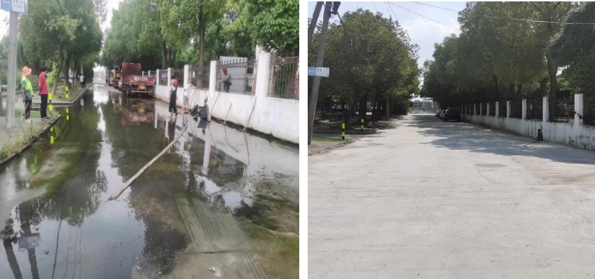 2023年5月,防汛排涝安全排查期间,厂区大门口进出主干道雨天积水情况严重。由于厂区主干道周边有闲置空地,载重卡车和社会车辆随意停放,严重影响进出厂区生产运行车辆通行;载重卡车碾压造成道路坑洼不平、雨污管道损毁严重,导致厂区和周边社区晴天污水满溢,雨天雨污横流、水深路滑,严重影响洛社污水厂的安全生产及社区居民的正常生活。