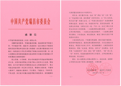 近日,江西公司收到来自九江瑞昌市、洛阳嵩县石场村等地的感谢信和致谢锦旗,以感谢公司在乡村振兴上做出的积极贡献。