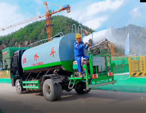 姚店项目制定了扬尘治理措施,严格落实“七个到位,六个百分百”要求。施工现场配有环境监测系统,同时配备雾炮机及喷洒两用雾炮车各一台,每天由专人不定时进行喷洒;采用绿色密目网覆盖所有裸土;临时道路利用混凝土硬化,排水通畅并设专人不定时清扫;原材料及半成品按总平面布置图堆放,用防雨布覆盖,及时整理清运废弃材料;车辆出入口设有自动洗车台,可对车辆进行及时冲洗。