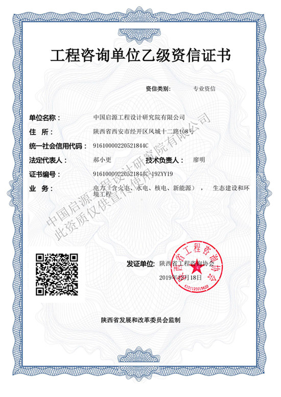 近日,中国启源喜获工程咨询单位电力(含火电、水电、核电、新能源)专业、生态建设和环境工程专业乙级资信证书,该证书有效期限为2019年12月18日至2022年12月17日。