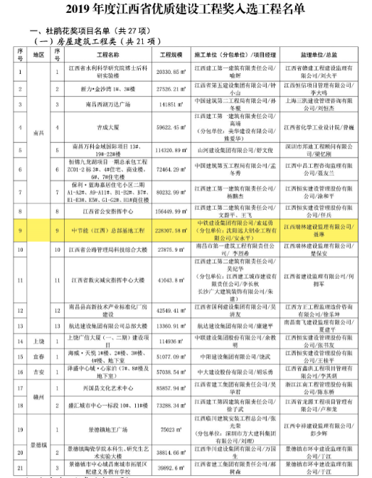 近日,江西省住房和城乡建设厅公布2019年度江西省优质建设工程奖入选工程名单。江西公司中节能国际中心项目凭着过硬的实力和高品质的质量,喜获江西建筑最高奖一一杜鹃花奖。