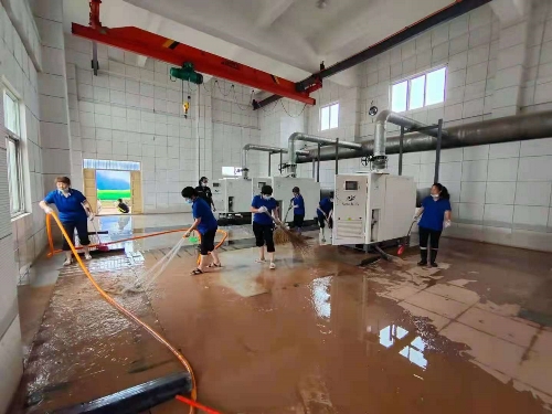 由于城北厂地势稍高,洪水倒灌现象较为轻微。淇县公司第一时间制定方案,从严从细做好城北厂复工复产工作。员工们舍小家为大家,第一时间赶赴厂区,积极参加现场清淤作业。7月25日,天气转晴,为预防洪水过后造成的传染疾病,公司对城北厂进行全面消杀,努力避免“大灾之后的大疫”,坚决保障职工健康安全。