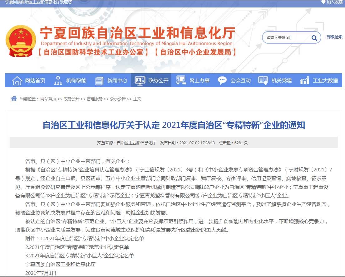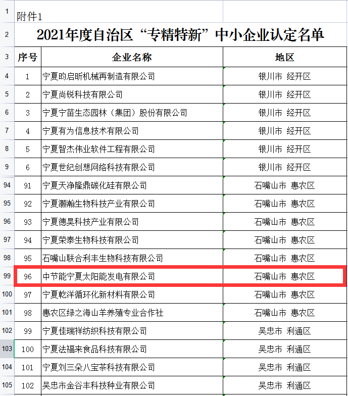 近日,根据宁夏回族自治区培育“专精特新”中小企业,引导中小企业走“专精特新”发展之路的工作要求,自治区工业和信息化厅组织评定了2021年度自治区“专精特新”中小企业,太阳能公司下属中节能宁夏太阳能发电有限公司凭借生产经营状况良好、科研成果显著、管理精细化深入等优势被认定为2021年度宁夏回族自治区“专精特新”中小企业。这是对太阳能西中区宁夏公司创新能力强、运营质量优、发展前景好的充分肯定,对进一步强化太阳能西中区科技平台建设、助推太阳能公司高质量发展具有重要意义。