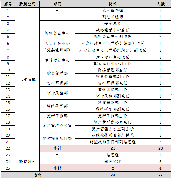 (1)针对工业节能公司目前部分核心岗位紧缺人才,采取内外部公开竞聘方式进行人才选拔,竞聘人员范围涵盖集团公司全系统所有在职员工及社会优秀人才。核心岗位紧缺人才包括:安全总监、战略经营中心主任、建设运行中心主任、人力行政中心(党委组织部)主任、科技研发部主任;