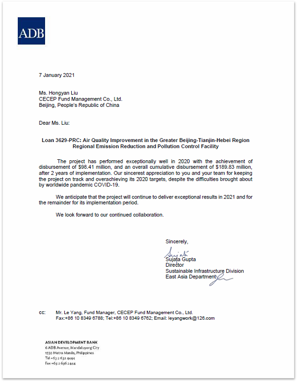 2021年1月7日,亚洲开发银行致信中节能资本所属基金公司,祝贺基金公司连续两年超额完成亚行提款目标。