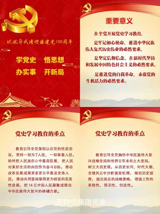 2月20日,习近平总书记在党史学习教育动员大会上发表重要讲话,深刻阐述了开展党史学习教育的重大意义,深刻阐明了党史学习教育的重点和工作要求,对党史学习教育进行了全面动员和部署,为开展好党史学习教育指明了方向。新时代集团党委及时组织学习贯彻习近平总书记重要讲话精神,第一时间对全系统学习教育作出部署安排,制作宣传手册,并将开展党史学习教育的重大意义和重点内容逐层分解,要求各级党组织和广大党员干部做到学史明理、学史增信、学史崇德、学史力行,从党史学习教育中汲取智慧力量,以更加昂扬的精神状态和奋斗姿态,建功新时代,奋进新征程。