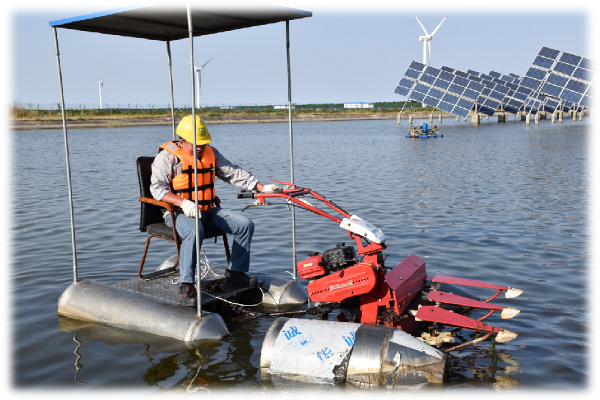 繁忙的工作反而促使了思想的迸发。刘加勇在工作中遇到困难总会思考更为先进的工作方式。水面上的杂草为检修工作带来了不小的麻烦、每一块板子维修更换又异常繁杂,如何更加便捷安全地进行维修更换、提高工作效率成了刘加勇的一个“心病”。工作中的挑战转化为思维的火花,迸发出劳动的激情。刘加勇带领团队成功研制了“一种太阳能组件跟踪支架吊装工具”和“一种太阳能组件跟踪支架支撑工具”用于主轴更换时支撑农门架,解决了运维时的效率低下问题;“一种水上打草机”能够以快捷,高效的方式清洁水面,大大减少了电站两千六百亩的海面除草时间;“一种太阳能光伏组件驱鸟装置”防止了海鸟对发电设备的侵扰,保障了光伏板的安全性和发电效率。在原有“一种水上打草机”的基础上,刘加勇进一步改良,又申请了“一种载人水上打草机”专利,目前这几项工具均获得了国家级的实用新型专利授权。