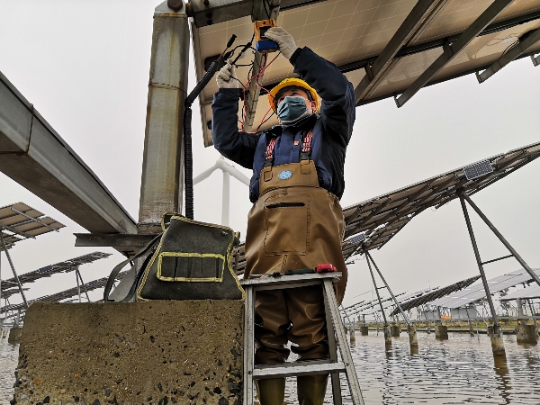 太阳能华东区东台电站坐落于黄海之滨,三十五万块太阳能电池板占据了这两千六百亩的海面,彷如海岸边的“书页”,记录着这座电站的事和人。而它们的“第一页”记载着一名叫做刘加勇的汉子。