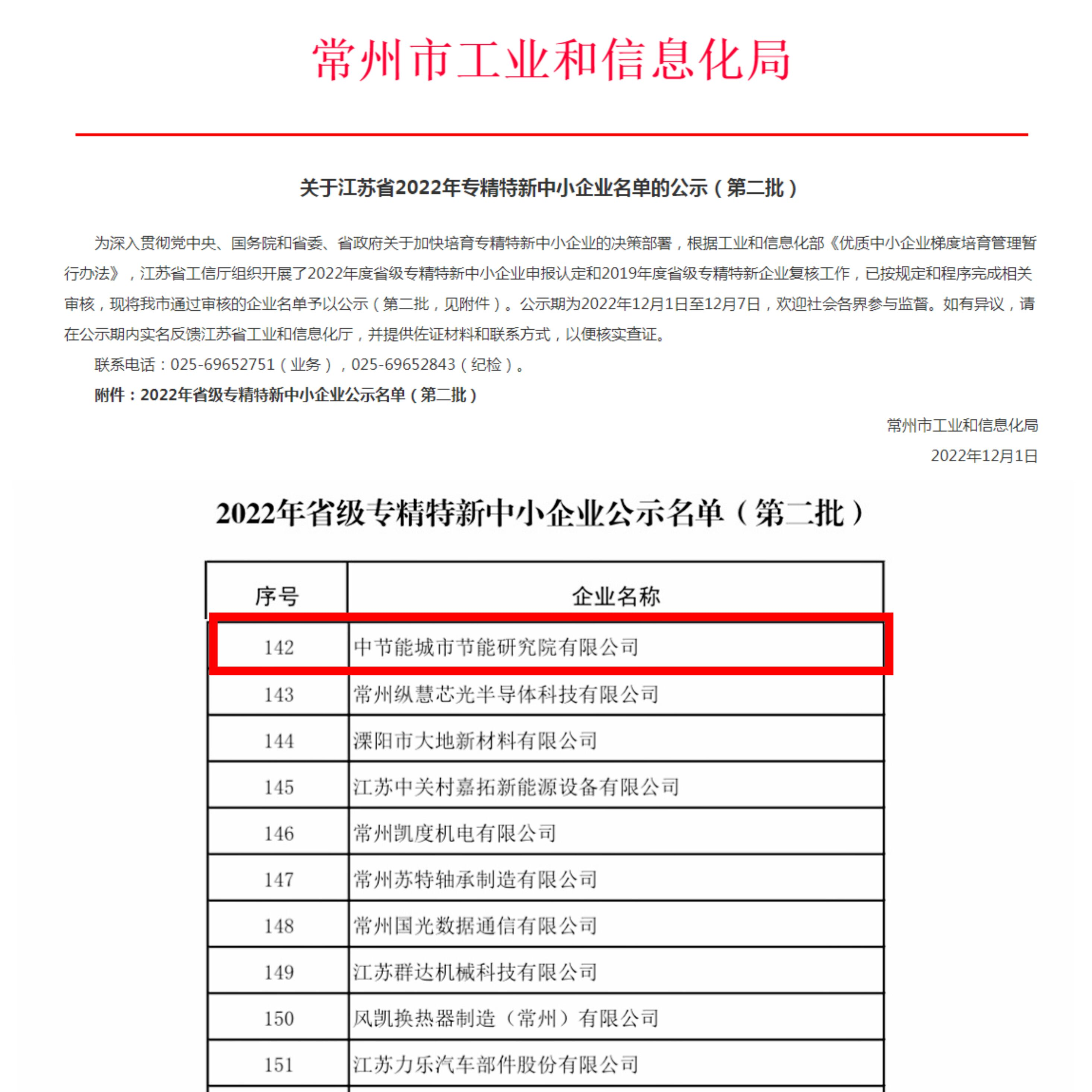 12月1日,江苏省工信厅完成2022年度省级专精特新中小企业认定,中节能城市节能研究院有限公司成功入选“2022年江苏省专精特新中小企业”。