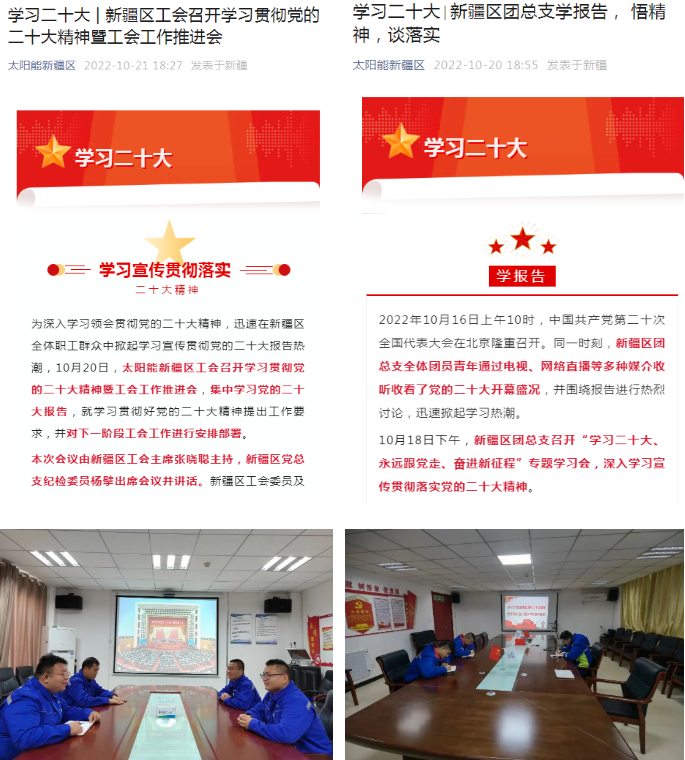 新疆区党总支坚决做到高起点谋划、高质量推进、高标准贯彻,认真落实归口意识,对照集团公司、太阳能公司党委深入学习宣传贯彻党的二十大精神方案要求,依托爱党爱国爱企学习教育活动,开展“贯彻二十大·阅享新征程”、“礼赞新时代·奋进新征程”、“我和家人一起感悟二十大”、“二十大快问快答”“我把党的二十大讲给你听”“晒晒二十大学习笔记”等系列活动,切实把学习宣传贯彻党的二十大精神和“科技创新年”、推动“三新两保一推进”目标任务结合起来,忠实践行让天更蓝,让水更清,让世界更美好的愿景,全方位、多角度地展示大区工作成效,以防风险、保安全、护稳定、促发展的新成效为中国式现代化建设贡献力量。
