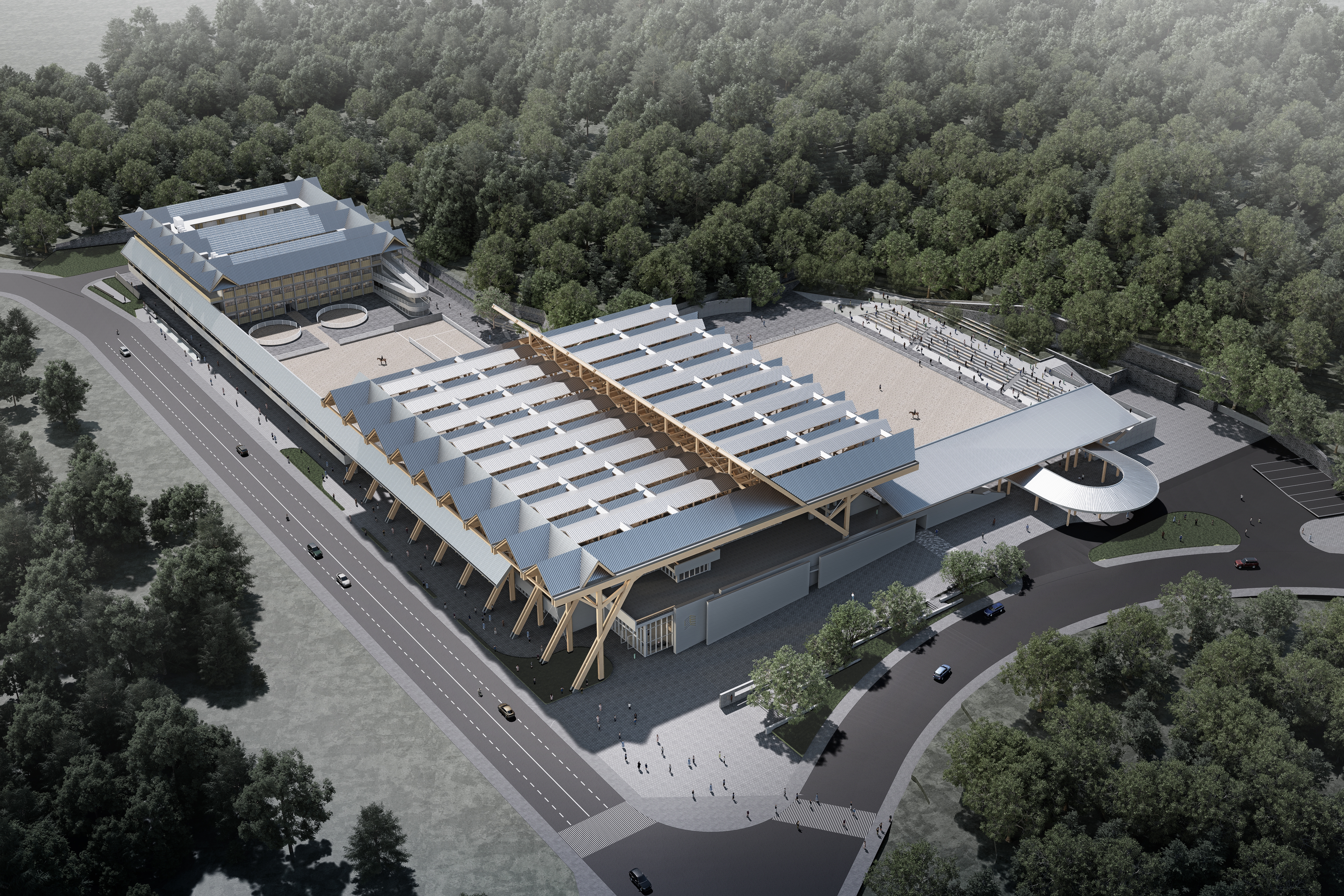 项目位于深圳市光明区光明街道总建筑面积69000平方米定位为符合国际马术五星级赛事标准的永久性场馆包括主赛场、室内训练馆、室外训练场赛事用房及马匹生活用房等
