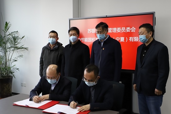 为贯彻落实银川市人民政府和中国节能环保集团战略合作协议,2020年3月5日,中节能国机联合电力(宁夏)有限公司与苏银产业园管委会在智慧研发大楼签署《苏银产业园综合能源投资合作意向协议》。苏银产业园管委会副主任郝玉峰、联合电力宁夏公司总经理胡健代表双方签署了协议。银川市副市长、苏银产业园管委会主任田国俊,中节能工业节能有限公司副总经理、联合电力宁夏公司董事长任育杰出席签约仪式。