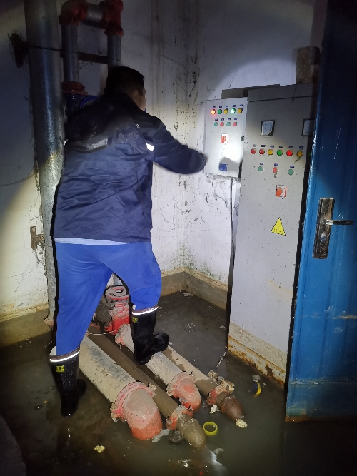 工程三处接到命令后立即调集人员投入现场,与二供中心及时联动,分区域开展抢险工作。他们冒着瓢泼大雨,克服道路积水不便,不停奔赴多个小区泵房,排除二供泵房设备故障和积水。