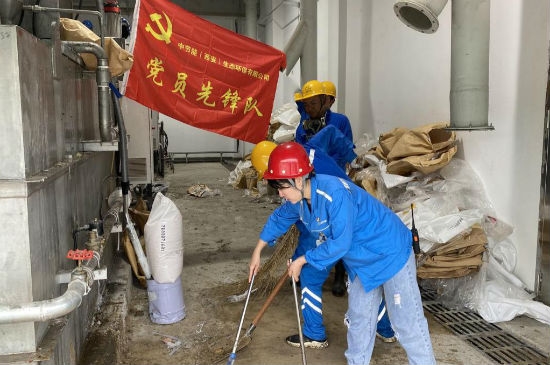 7月16日,针对干料仓严重板结的情况,中国环保西安生态公司公司党支部发动党员先锋队20余人,冲在了清理工作的最前线,打响了清理污泥板结歼灭战。