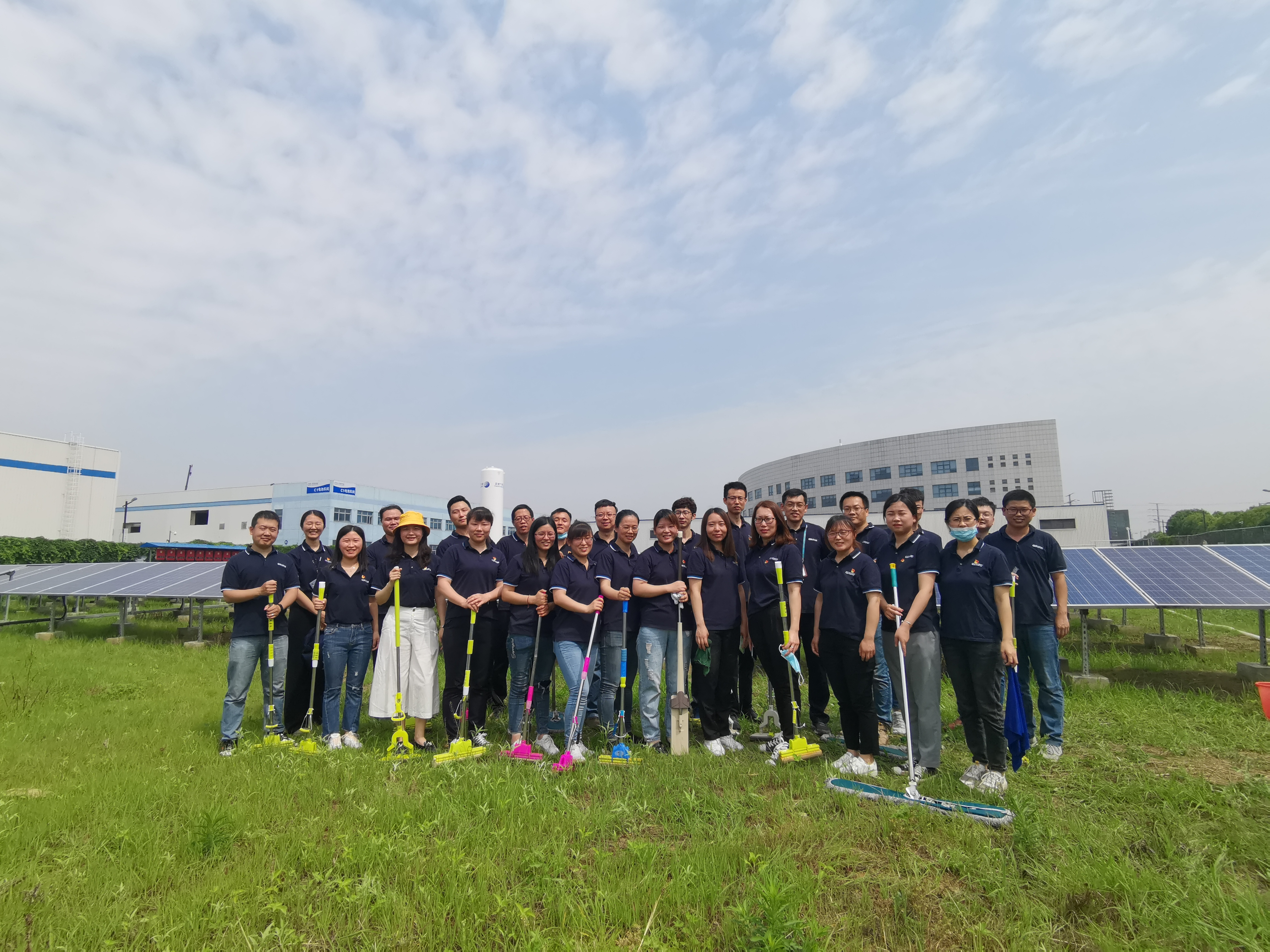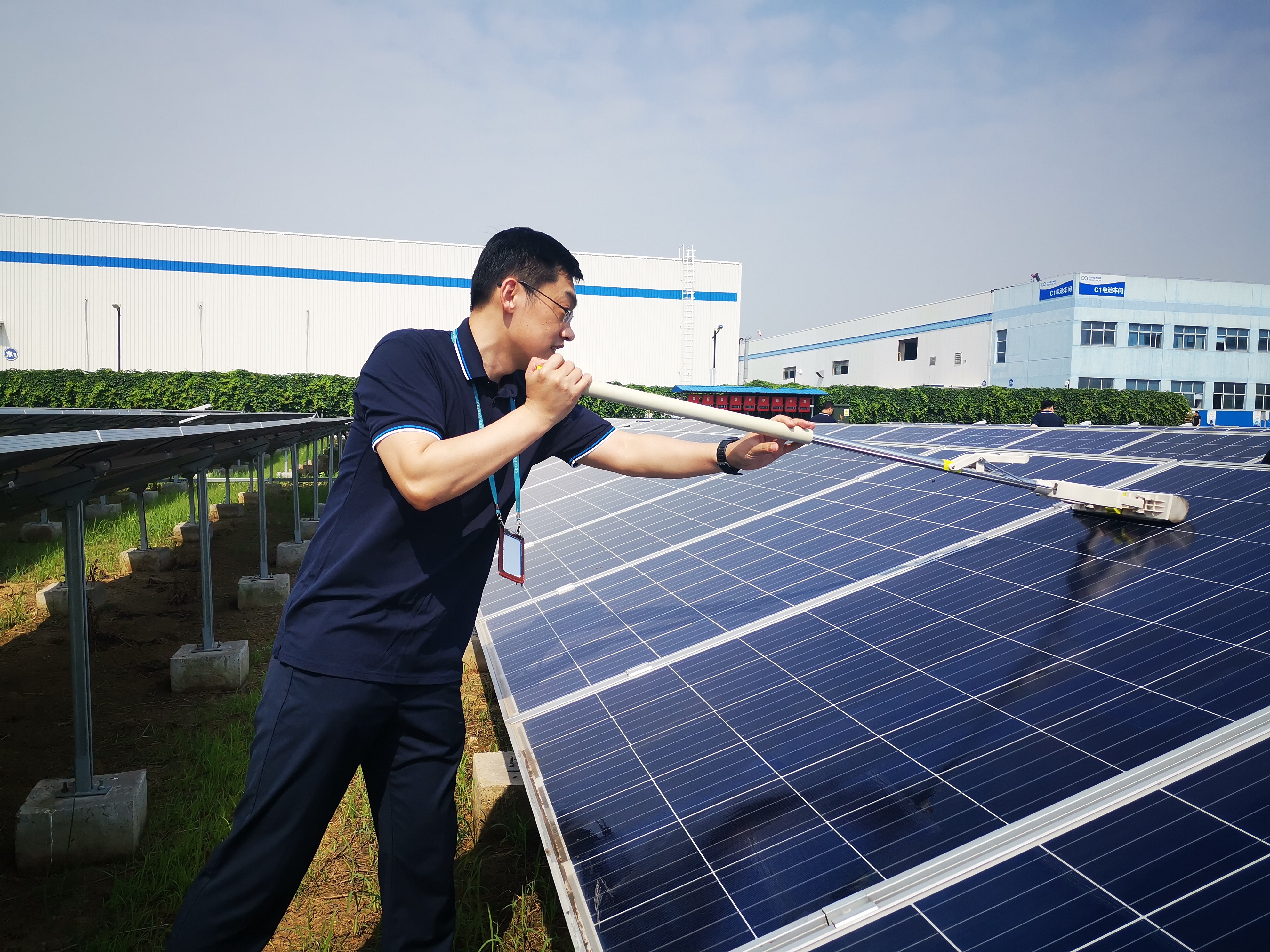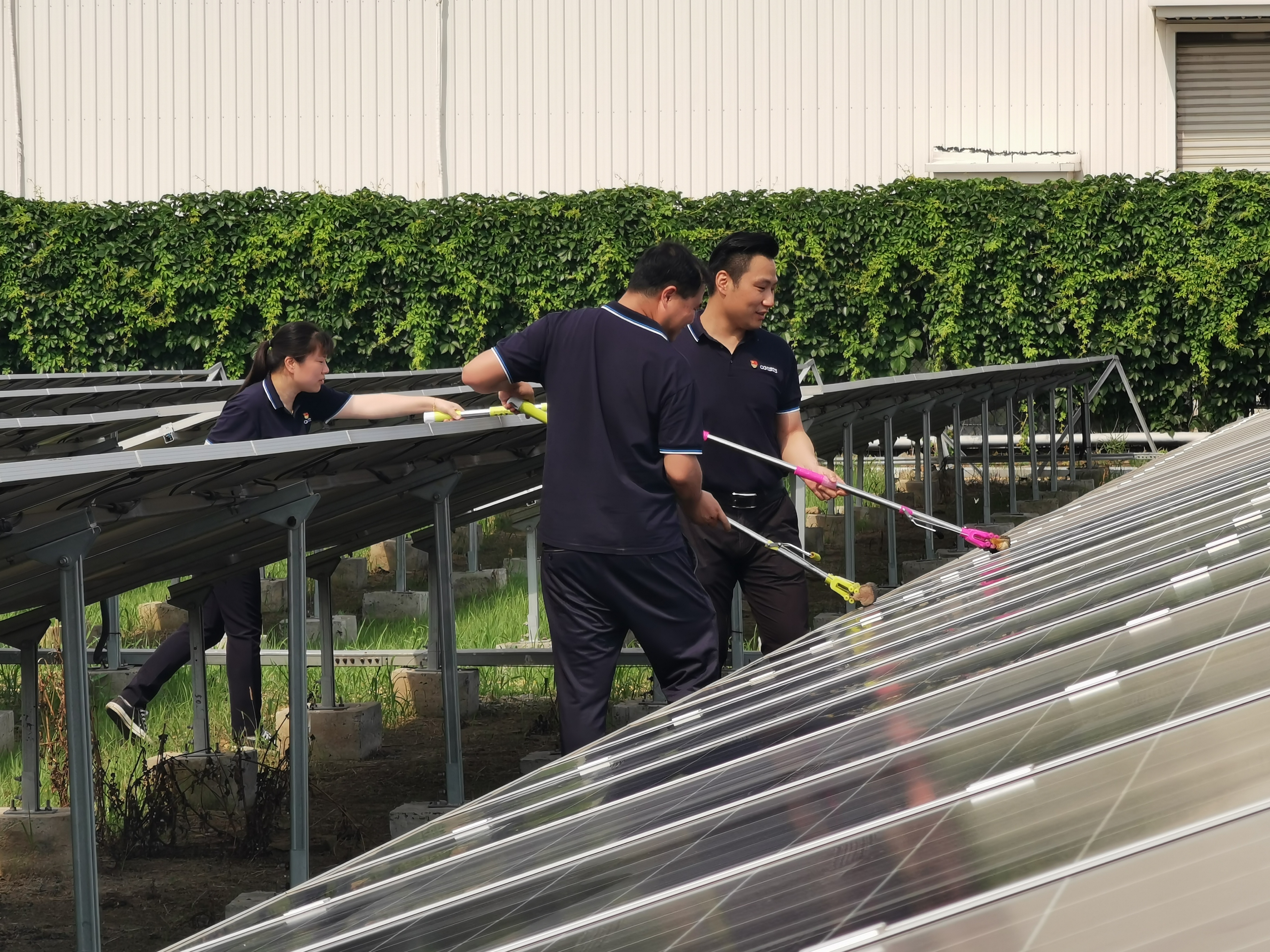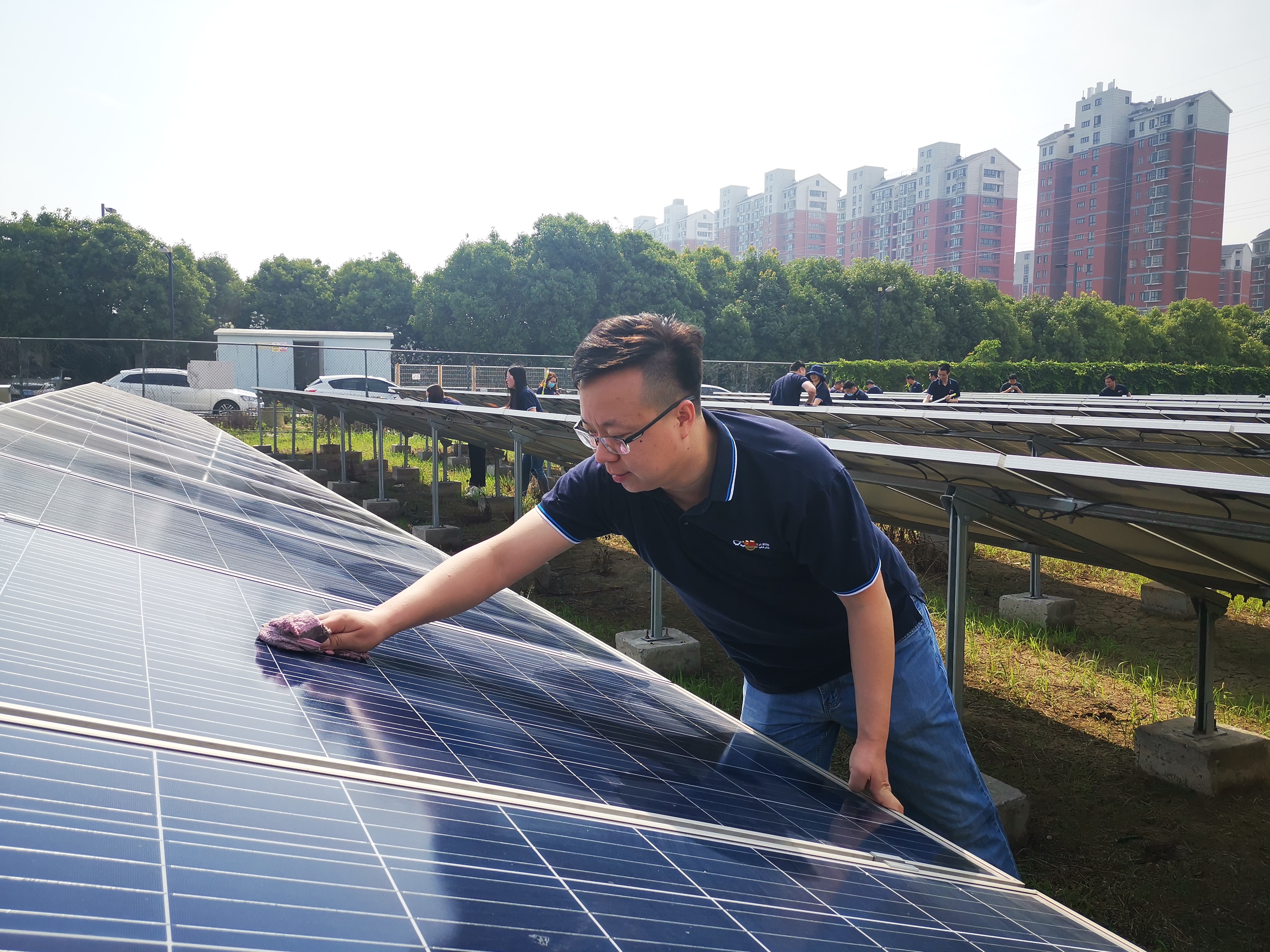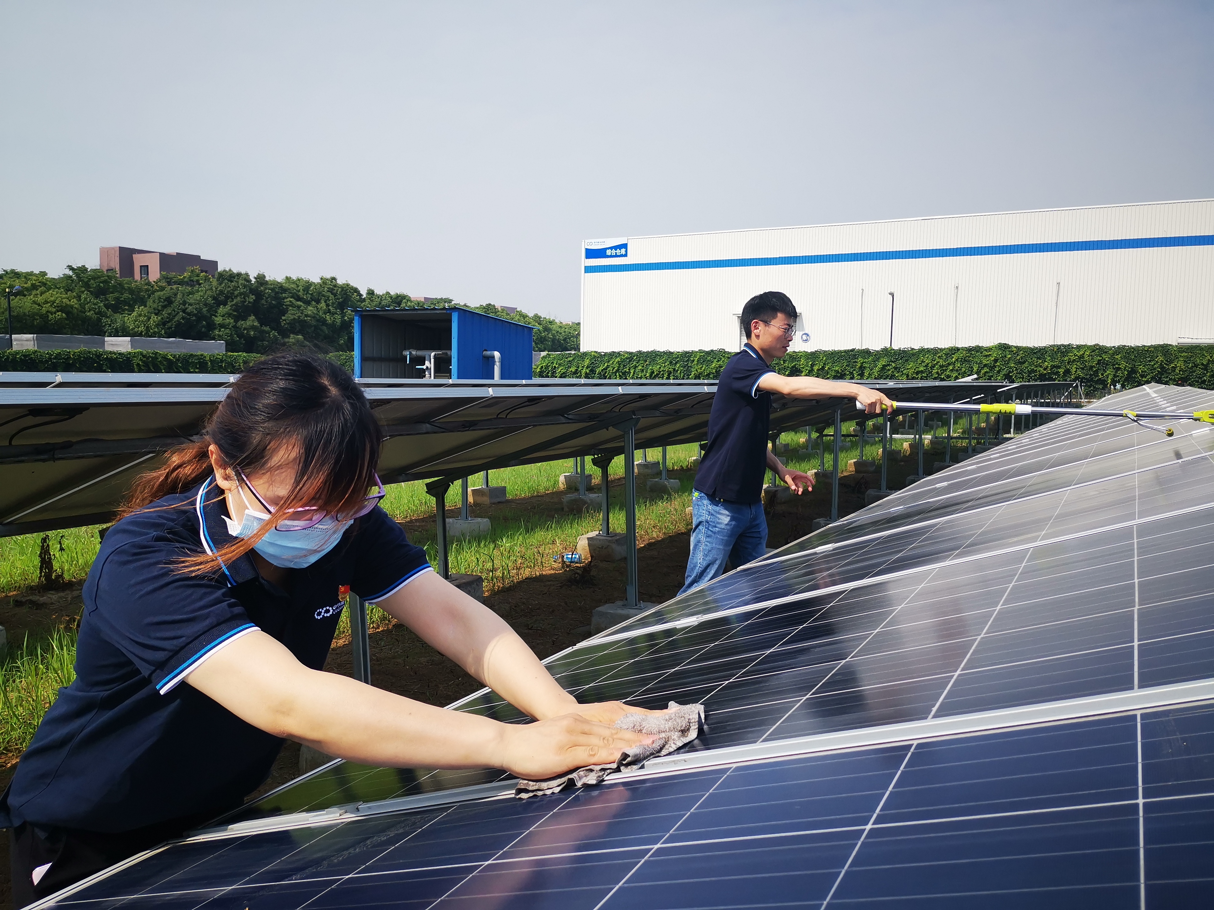 本次主题党日活动以“青年力量”党员志愿服务为主题,组织党员对公司地面分布式电站组件进行清洗,从而提高组件发电量。活动开始前,安监厂务部电站运维工程师陈海峰详细讲解组件清洗的注意事项及步骤。掌握清洗要领后,全体党员拿上事先准备好的拖把、抹布、水桶等工具,积极投入到组件清洗工作中。虽然天气非常炎热,但大家充分发扬不怕累、不怕脏精神,争先恐后,干劲十足,仔仔细细地对组件上的灰尘、砂石、鸟类粪便等进行清洗。经过1个多小时的奋战,同志们流出的汗水有了成效,组件换了新颜,现场共计清洗了约1080块组件,月度发电量约能提高1909KWH。