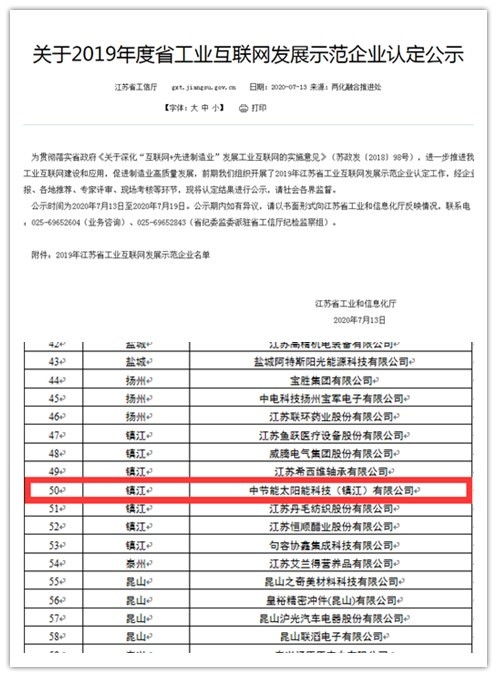 推动工业互联网的一个重要内容,就是要实现制造业的智能化。太阳能镇江公司作为光伏制造型企业,一直以来非常重视企业智能化升级改造,更重视技术研发和互联网工厂建设,积极推进两化融合工作,在2018年就通过了国家两化融合管理体系贯标评定,并于2015、2019年分别获评江苏省智能车间。公司建立了“中节能光伏云工业互联网集成平台”,攻克核心工艺数字化、工业物联感知、设计应用MES、ERP、SPC、BI、TPM、TCM、OPC、IOT、云平台等多系统集成运行等核心关键技术,实现了生产供应链协同信息化、生产管理智能化、设备监控管理集中化、质量管控实时化全程化,实现订单生产过程全程管控和生产过程自动化控制,打造会思考的工厂,让数据成为生产力。