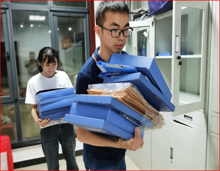演练人员模拟资料室漏水,检查楼顶,清除楼顶封堵的排水管,转移资料,排除险情。