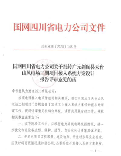 10月19日,风电西中区域公司四川广元剑阁县天台山风电场二期项目接入系统方案获得国网四川省电力公司批复(川电发展〔2020〕165号文件)。
