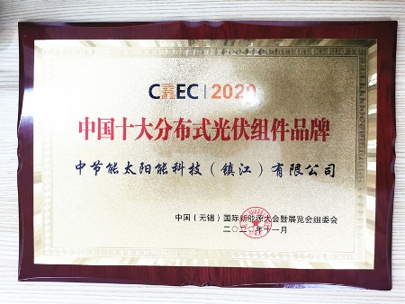 近日, 由中国(无锡)国际新能源大会暨展览会(CREC)组委会举办的“CREC2020中国十大分布式光伏品牌颁奖盛典” 于江苏无锡盛大举行。中节能太阳能科技(镇江)有限公司凭借优秀的技术创新和品牌建设,荣获“中国十大分布式光伏组件品牌”称号。