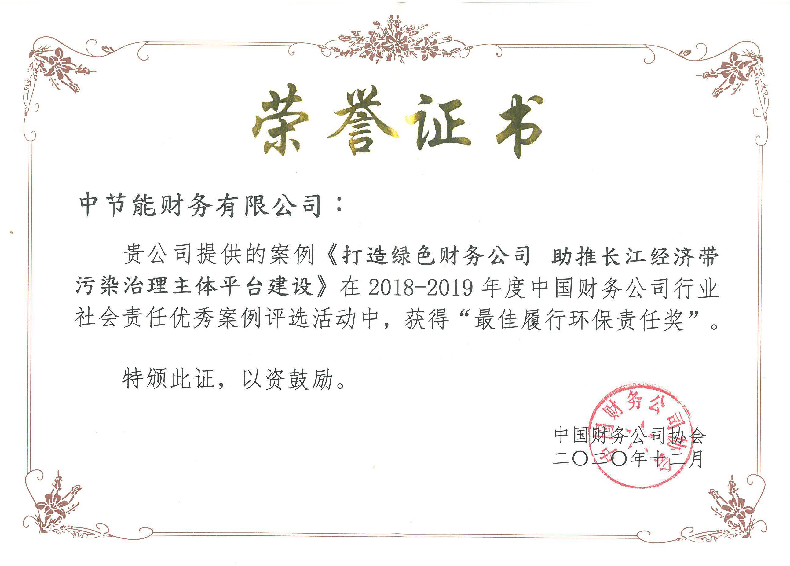 为全面展示企业集团财务公司行业社会责任履行情况,推进社会责任实践工作深入开展,提升社会责任管理水平,中国财务公司协会于2020年在全行业内组织开展了《中国财务公司行业社会责任优秀案例评选活动》。中节能财务有限公司高度重视,多方组织,积极参与,严格把控案例报送质量。近日,评审结果公布,中节能财务有限公司“打造绿色财务公司 助推长江经济带污染治理主体平台建设”相关案例,荣获中国财协“最佳履行环保责任奖”。