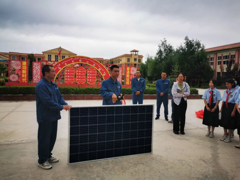 宣讲过程中,舒奇蒙电站安全员陈旭从电的简单认识、电的危害、生活中安全用电、雷电危害与防范、安全用电顺口溜等方面开展宣讲,通过趣味图文及视频的形式,由浅入深地为学生们开展了一堂生动的电力科普课程,并不时通过互动问答加深学生对所学知识的印象,让学生们懂得了什么是电,怎样安全用电,避免用电伤害。随后,学生们来到操场,由阿克苏党支部党员郝雪峰向学生们进行现场演示太阳能发电的过程,让学生了解光伏发电基本原理的同时,也初步认了生活用电来源。