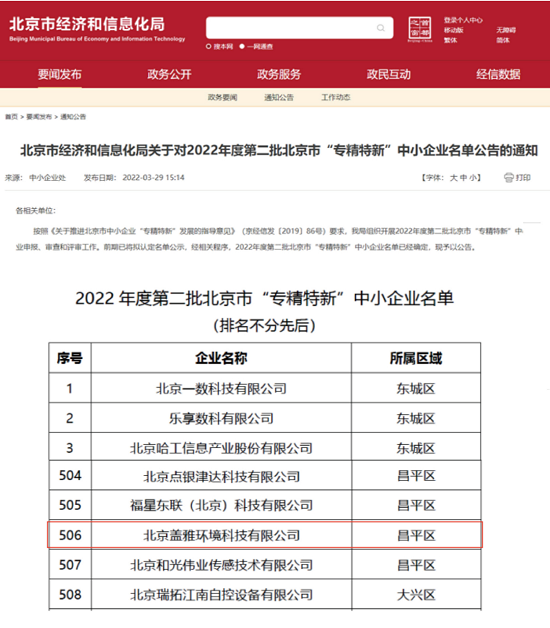 近日,北京市经济和信息化局正式发布了《关于对2022年度第二批北京市“专精特新”中小企业名单公告的通知》,中节能铁汉下属盖雅环境榜上有名,获评北京市2022年度“专精特新”中小企业。