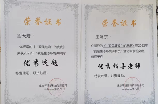 中国环保即墨公司参加生态环境部举办2022年“我是生态环境讲解员”活动,全天芳的原创生态环境选题《“乘风破浪”的皮皮》荣获“优秀选题”奖项。