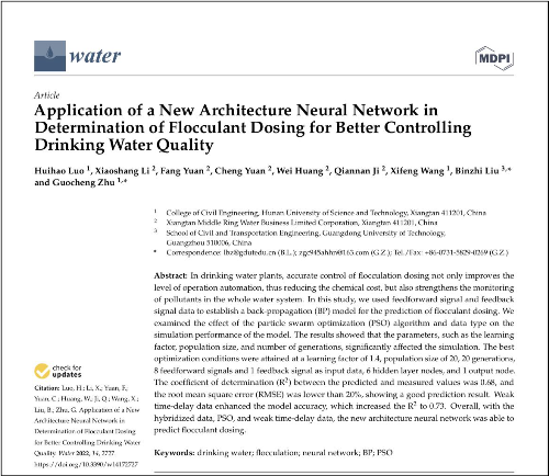 近日,中环水务下属湘潭中环水务有限公司“自来水厂净水系统中絮凝神经网络的构建”项目研发团队的研究成果——题为《Application of a New Architecture Neural Network inDetermination of Flocculant Dosing for Better ControllingDrinking Water Quality》的学术论文在瑞士《Water》(影响因子3.530)期刊上正式发表。该研究团队的另一篇题为“Developing flocculation tensor to monitor water quality using deep learning model”的学术研究成果也即将在德国《Environmental Chemistry Letters》(环境化学快报)(影响因子13.615)上刊登。这两篇论文都将录入SCI数据库。