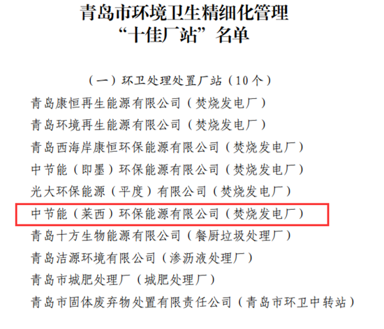 10月25日,青岛市城市管理局和青岛市环境卫生协会联合公布了2022年度全市环境卫生精细化管理“十百千”评选结果。中国环保莱西公司获“十佳厂站”荣誉称号。