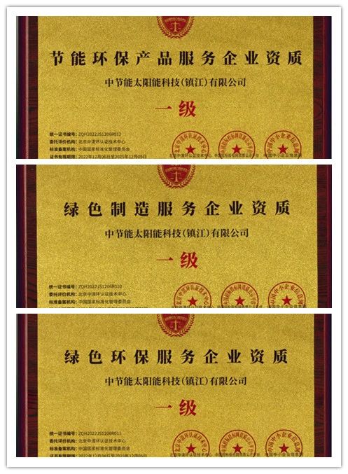 近日,太阳能镇江公司荣获“节能环保产品服务企业资质一级”、“绿色环保服务企业资质一级”、“绿色制造服务企业资质一级”荣誉称号。