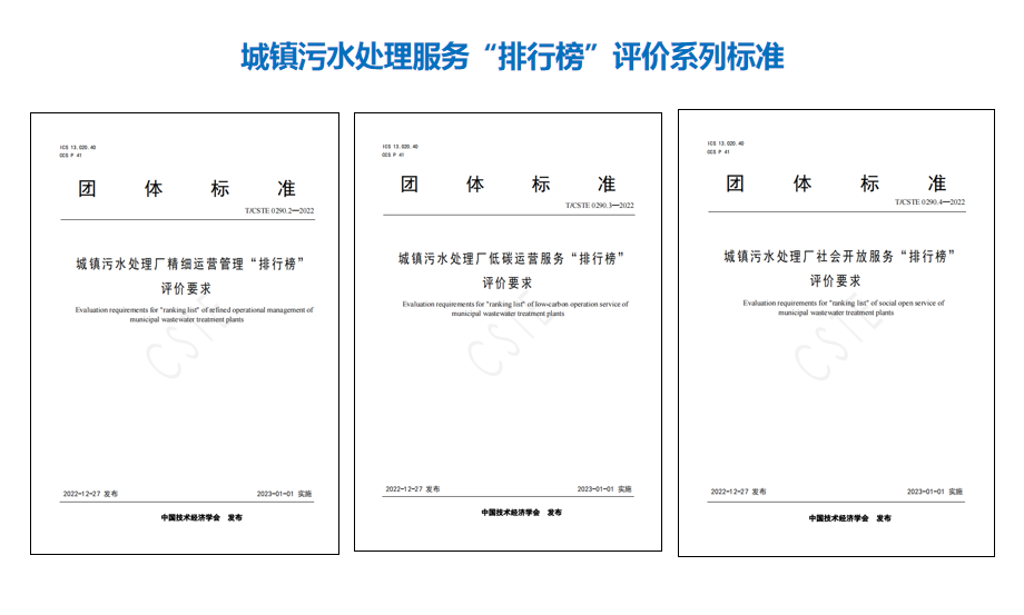 《城镇污水处理厂精细运营管理“排行榜”评价要求》(T/CSTE 290.2-2022)首次从风险防控、管理体系、效能管理、创新发展等方面对污水厂运营管理水平开展全面评价,为污水厂规范化、精细化、专业化运营指明了目标和发展方向,助力企业高质量发展。《城镇污水处理厂低碳运营服务“排行榜”评价要求》(T/CSTE 290.3-2022)通过对城镇污水处理厂设施设备低碳改造、低碳建设、优化运行、监测与核算等低碳行为进行鼓励,为污水厂低碳建设和低碳运营提供了路径参考和评价方法。《城镇污水处理厂社会开放服务“排行榜”评价要求》(T/CSTE 290.4-2022)规范了污水处理设施向公众开放的内容及基础条件等开放要素,为评价污水厂社会开放功能服务标准水平提供了标准和方法,为引导拓展污水厂多元化社会服务功能以发挥更大的社会价值提供了升级发展方向。