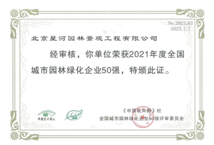 近日,2023园林产业高质量发展论坛暨2021年度全国城市园林绿化企业高质量发展数据发布活动在山东泰安召开。会上,中节能铁汉所属铁汉星河荣获“2021年度全国城市园林绿化企业50强”荣誉称号,连续三年蝉联该奖项。