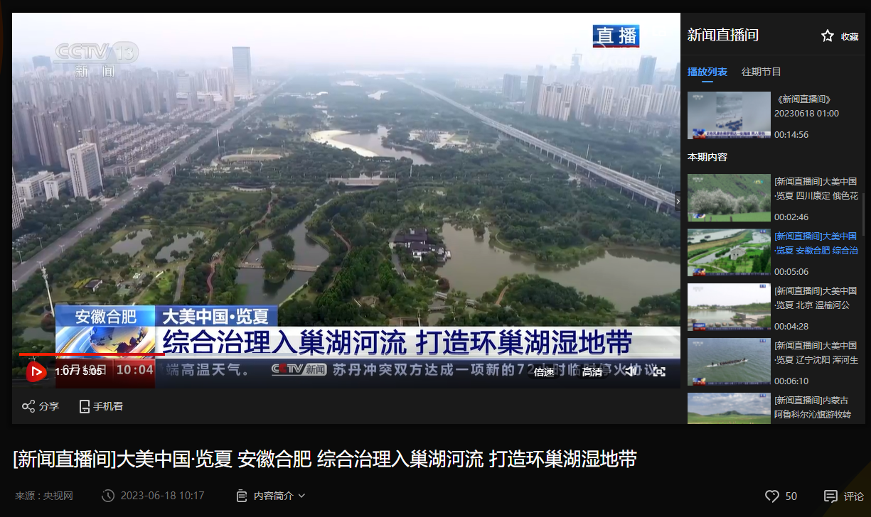 2023年6月18日,中央电视台新闻频道【新闻直播间】栏目“大美中国·览夏”专栏以“综合治理入巢湖河流,打造环巢湖湿地带”为题,对中节能国祯塘西河综合治理举措及成果进行了报道。