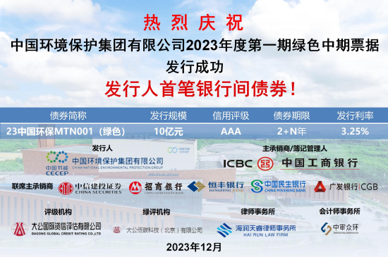 12月5日,中国环保成功在银行间发行2023年度第一期绿色中期票据,这是公司首次公开在市场亮相发行债券。