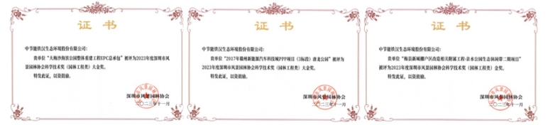 近期,深圳市风景园林协会颁发2023年度深圳市风景园林协会科学技术奖(园林工程类),中节能铁汉荣获二项大金奖、一项金奖。其中,大梅沙海滨公园整体重建工程EPC总承包、2017年赣州新能源汽车科技城PPP项目(3标段)唐龙公园喜获“大金奖”,梅县新城棚户区改造相关附属工程-亲水公园•生态休闲带二期项目喜获“金奖”。
