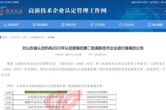近日,中国环保润达运营公司凭借专业的研发队伍,雄厚的技术实力,持续的创新能力,科学的企业管理,被顺利地认定为国家高新技术企业。