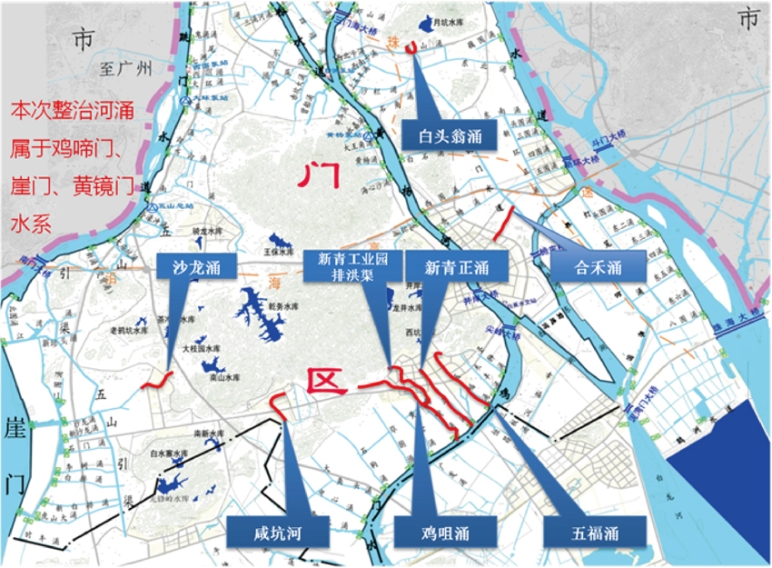 项目位于珠海市斗门区,施工范围分布在三个镇区,由8条河涌组成,分别为白蕉镇白头翁涌、合禾涌,井岸镇五福涌、新青正涌、新青工业园排洪渠、鸡咀涌,乾务镇咸坑河、沙龙涌。工程主要建设内容涵盖河道控源截污工程、内源清淤及底质改良工程、面源污染控制工程、水生态净化工程、生态景观提升工程、改善河道水动力工程、智慧水务系统建设工程、应急工程等,总治理长度21.05公里。