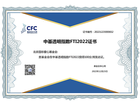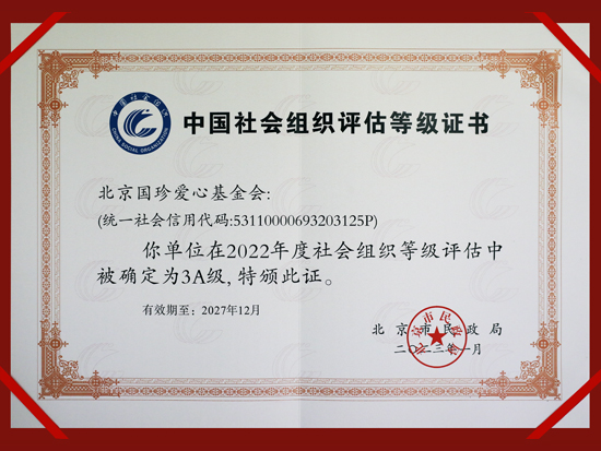 近日,在北京市民政局发布的2022年度社会组织等级评估中,北京国珍爱心基金会荣获AAA级社会组织评估等级,并在基金会中心网发布的中基透明指数FTI2022中,获得透明度满分100分殊荣。