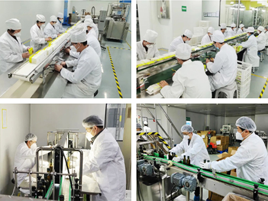 工人们元气满满忙中有序,产品生产热火朝天,供应链响应效率大幅提升。生产车间的员工们严格把关,检严守质量生命线;物流中心的员工们加班加点保运输。其他各部门员工也都齐上阵支援生产,力保免疫力产品的生产和供应。