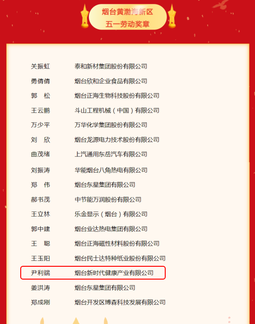 为表彰先进,树立榜样,进一步激发广大职工的劳动热情和创造活力,4月26日,烟台黄渤海新区召开了“五一”国际劳动节暨先进表彰大会上,新时代集团下属烟台新时代健康产业有限公司(简称烟台健康)员工尹利端被评为烟台黄渤海新区职工技术创新能手,荣获“五一”劳动奖章。