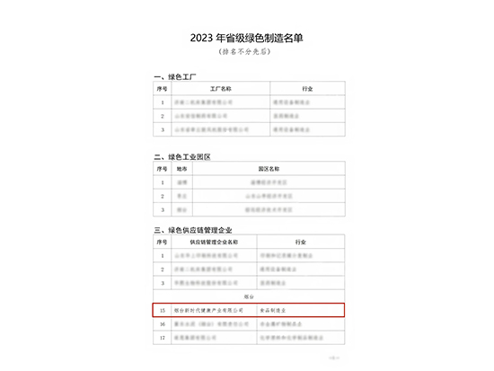 为达成工业领域碳达峰碳中和目标,实现公司可持续发展,新时代集团所属烟台健康公司近年来一直积极开展绿色供应链企业管理工作,经自我评价、第三方评价、市级工信部门评估推荐、专家论证、社会公示等程序,于2023年7月27日获评“省级绿色供应链管理企业”荣誉称号。