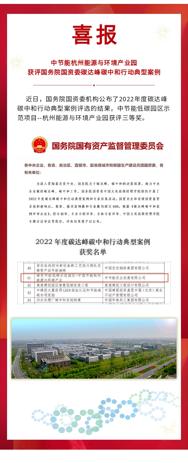 日前,国务院国资委正式公布《2022年度碳达峰碳中和行动典型案例评选结果》,中国节能旗下中节能实业公司杭州能源与环境产业园项目荣获典型案例三等奖。