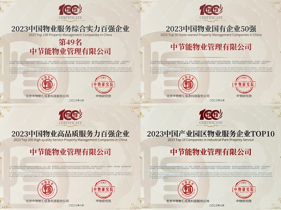 8月10日,2023中国物业综合实力百强企业研究发布会在昆明隆重举行,发布会由中物智库、中物研究院主办。会上,中节能实业下属物业公司荣获“2023中国物业服务综合实力百强企业 第49名”“2023中国物业高品质服务力百强企业”“2023中国物业国有企业50强”及子榜“2023中国产业园区物业服务企业TOP10”“2023中国红色物业服务领军企业”“2023中国物业社会责任贡献领军企业”“2023中国物业服务企业华东20强”“2023中国标杆物业服务项目”等八项殊荣。