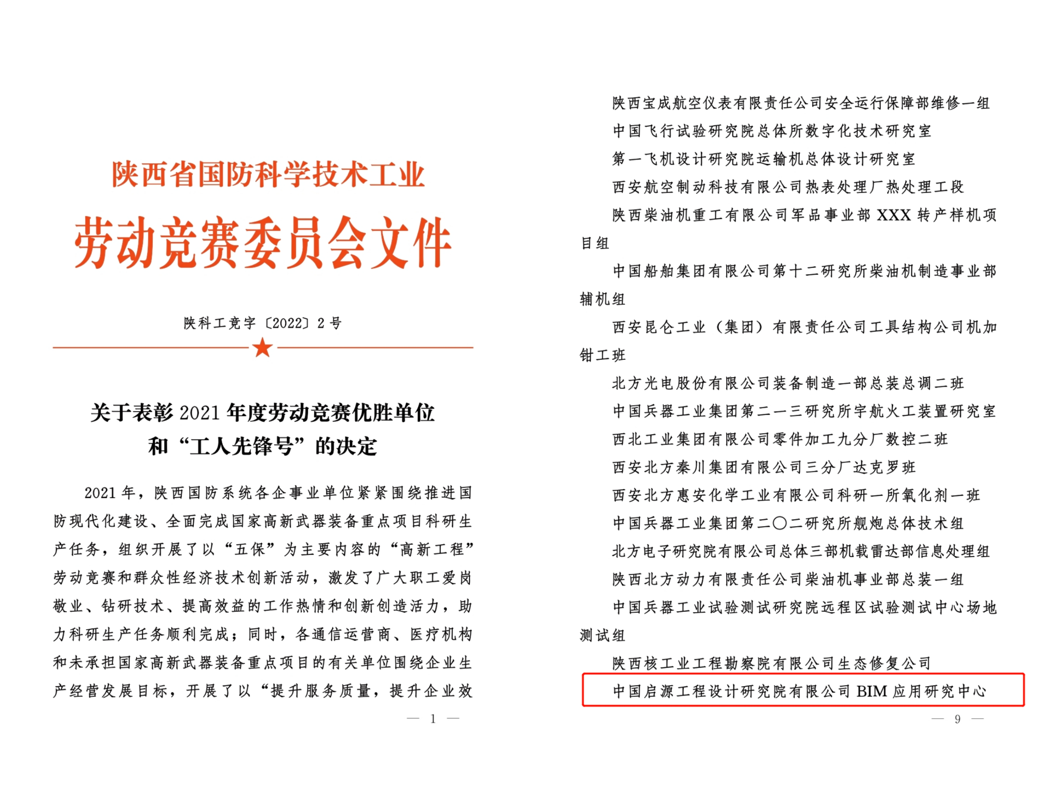 3月29日,陕西省国防工会第一届委员会第九次全体会议隆重召开,会上表彰了一批先进集体和个人。中国启源BIM应用研究中心被评为“陕西省国防系统工人先锋号”,公司工会被评为“2021年度重点工作考核优秀单位”。