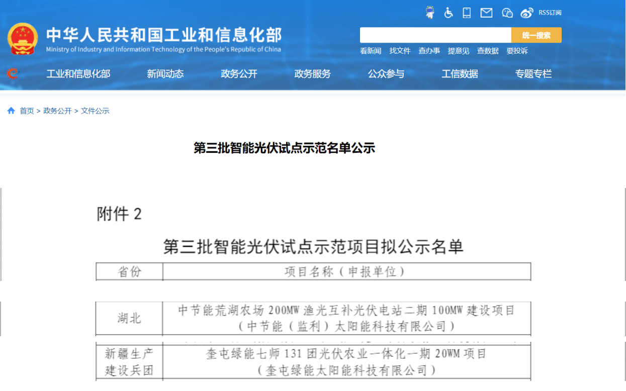 近日,国家工信部发布了第三批智能光伏项目试点示范名单,太阳能公司“新疆区的奎屯绿能七师131团光伏农业一体化一期20MW项目(以下简称奎屯项目)”和“华中区的中节能荒湖农场200MW渔光互补光伏电站二期100MW建设项目(以下简称监利项目)”2个项目成功入选。