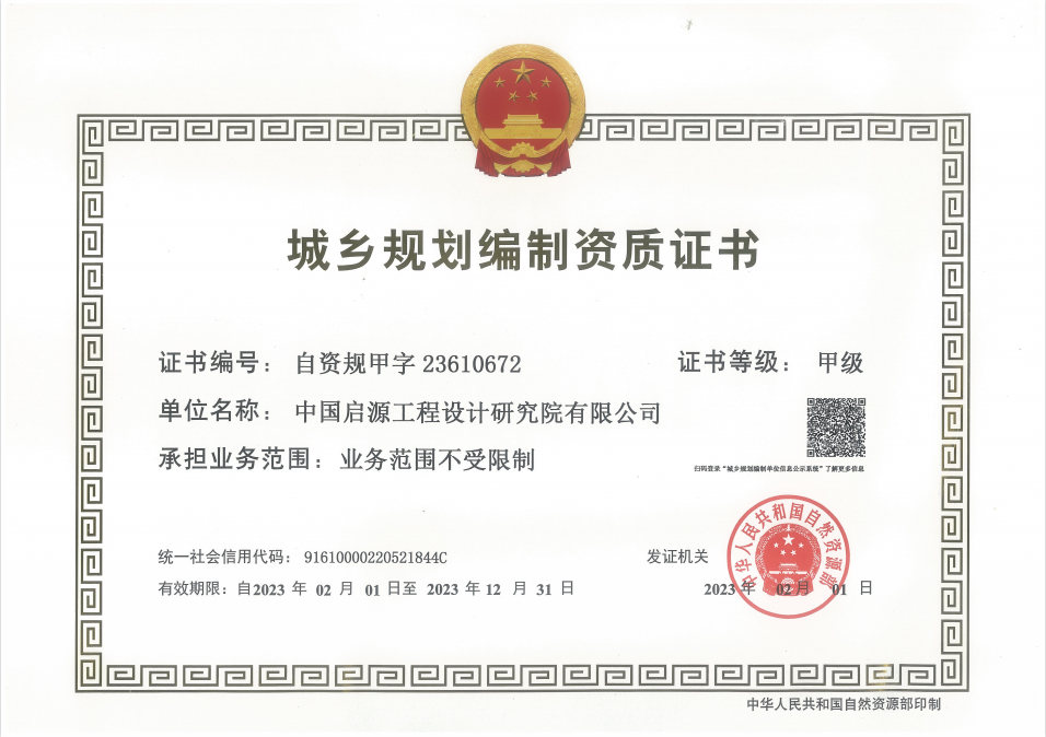 近日,经中华人民共和国自然资源部批准,中国启源工程设计研究院有限公司城乡规划编制资质成功升级为甲级。升级后,公司承担城乡规划编制业务的范围将不受限制。