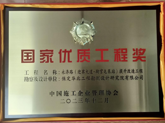 近日,中国施工企业管理协会公布的2022-2023年度国家优质工程奖评选结果中,中国地质工程集团有限公司河北分公司(原保定华北工程勘测设计研究院)参建的永济路(迎宾大道-鞠官屯泵站)提升改造工程项目荣获“国家优质工程奖”。
