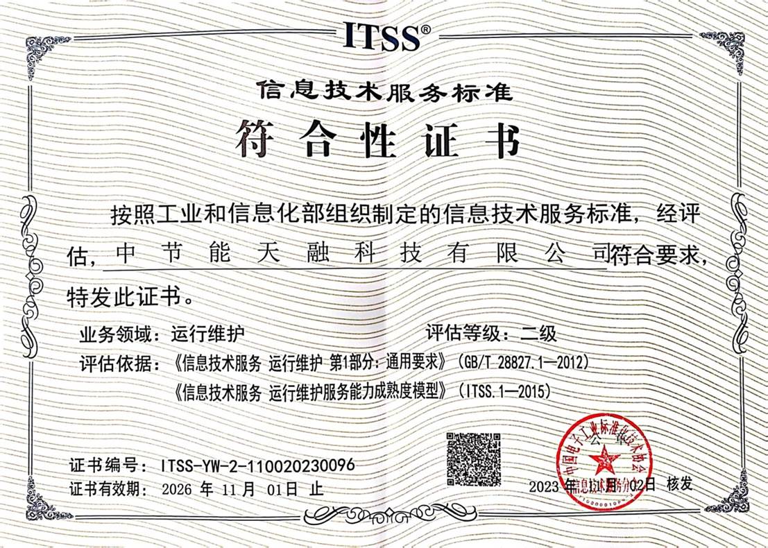 近日,中节能大数据有限公司下属中节能天融科技有限公司(以下简称天融科技公司)顺利通过了由工业和信息化部组织制定的信息技术服务标准(ITSS)二级资质认证评审,成功取得资质证书。